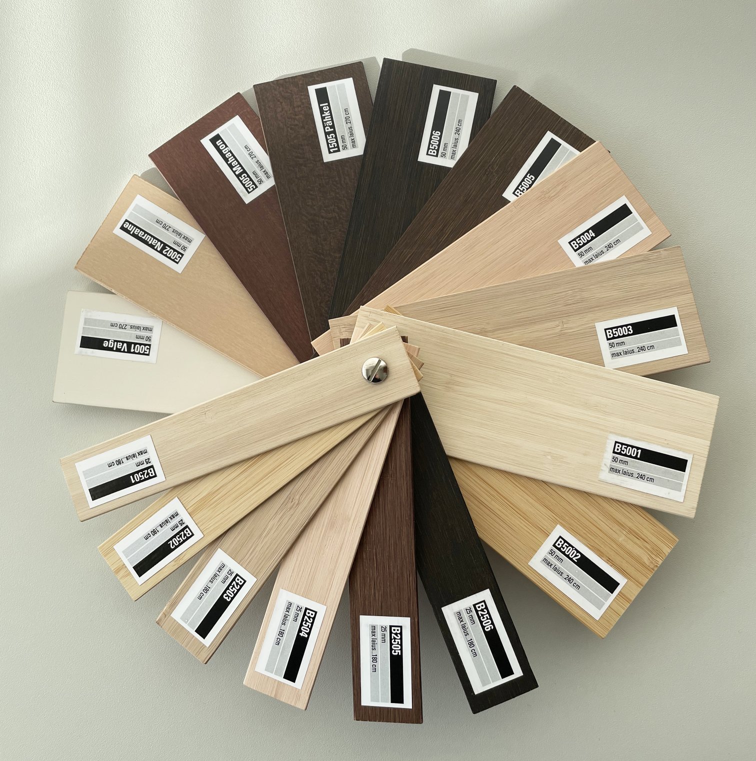Pakume oma klientidele bambusribasid mõõtmetes 25 mm ja 50 mm ja 6 erinevas toonis, nii viimistletud kui ka viimistlemata variandis. 4 erinevat heledat tooni lisavad ruumidele õhulisust ja kergust, samas kui 2 tumedat tooni lisavad ruumi sisekujundusse rohkem dekoratiivsust, sügavust ja müstilisust. Värvitoonidega tutvumiseks palun astuge läbi meie salongist!